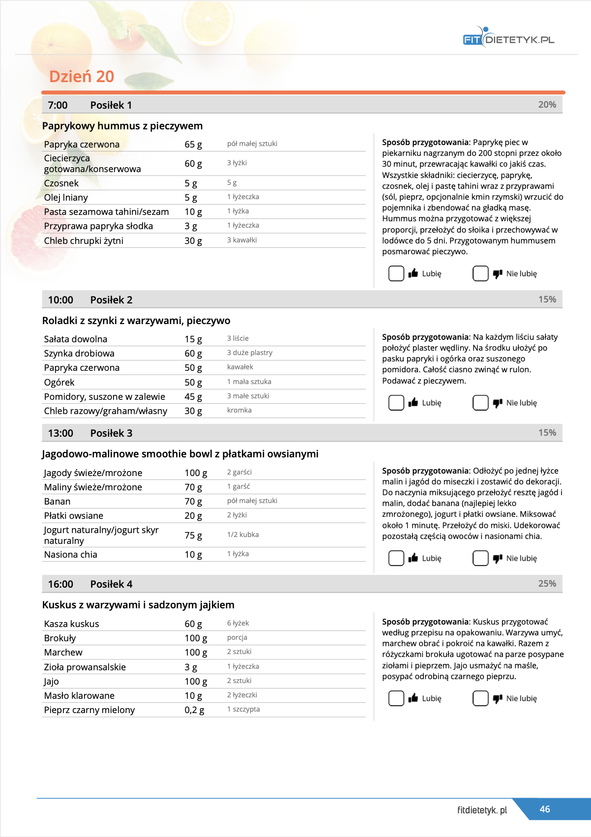 w formie precyzyjnych jadłospisów wielodniowych (na każdy dzień miesiąca jest opracowany osobny jadłospis). Tutaj nie musisz zastanawiać się co zjeść każdego dnia, gdyż będziesz mieć dokładnie wszystko rozplanowane.