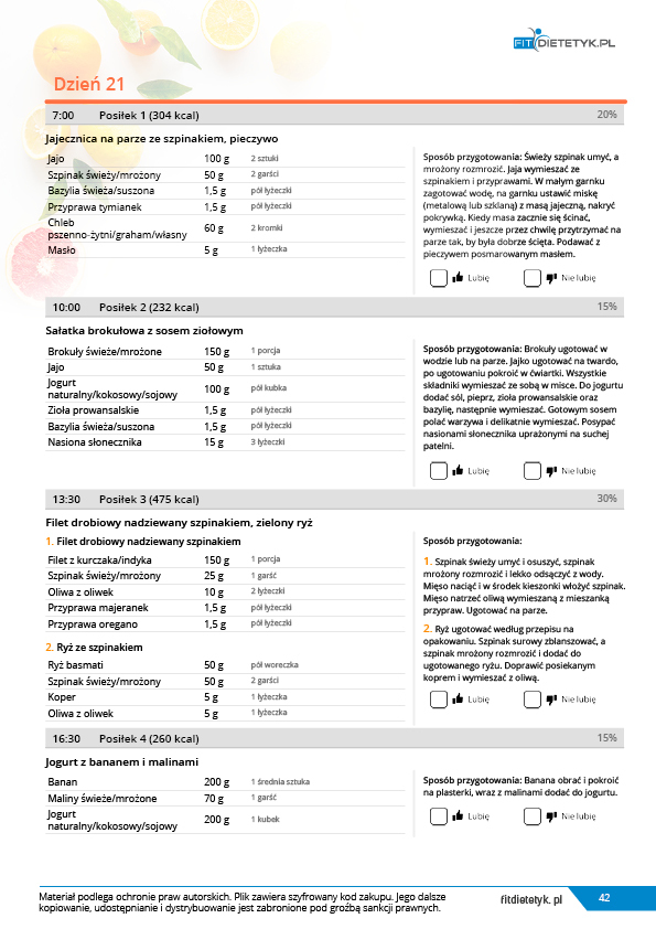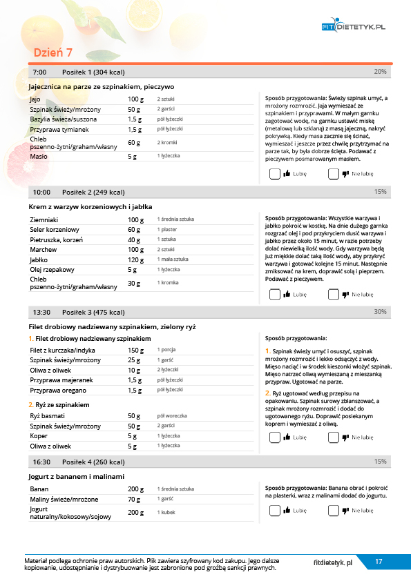 w formie propozycji posiłków (zamiast pojedynczych jadłospisów jednodniowych, przygotowano propozycje kilku propozycji dań na każdy posiłek). Tutaj nie uzależniamy Cię od tego jakie masz np. w danym dniu zjeść śniadanie czy obiad, tylko sam wybierasz sobie ulubione danie z kilku przedstawionych przez nas propozycji.