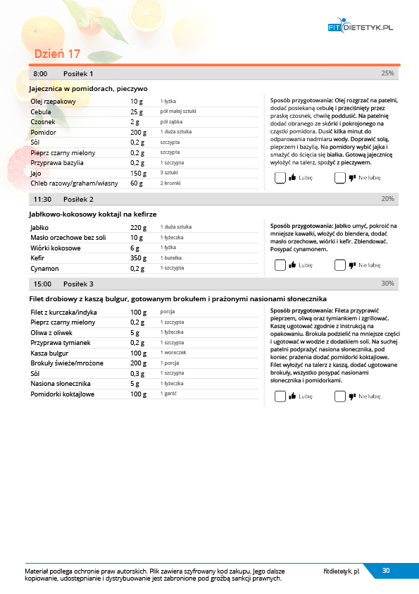 w formie propozycji posiłków (zamiast pojedynczych jadłospisów jednodniowych, przygotowano propozycje kilku propozycji dań na każdy posiłek). Tutaj nie uzależniamy Cię od tego jakie masz np. w danym dniu zjeść śniadanie czy obiad, tylko sam wybierasz sobie ulubione danie z kilku przedstawionych przez nas propozycji.